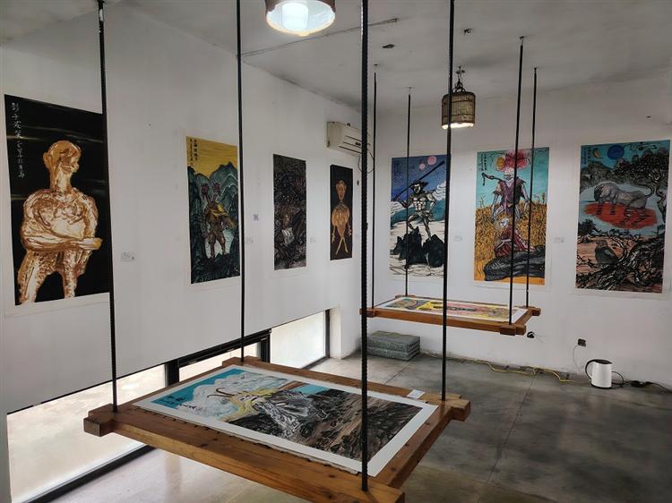 此次展出的水墨画作品50多幅,是楚子今年4月入住上苑国际艺术驻留中心后锐意创新,深度挖掘中国传统文脉精萃,大胆运用当代艺术语言和东西方哲学理念,用心熔铸的全新之作。重传统,大融合。他大胆运用和拓展焦墨画法起稿,自创全新皴法,骨法用笔,放胆敷色,手法多变,画面产生了强烈的视觉和哲学冲击。此次展出作品题材分为三大类:一是“山海经系列”从东方古籍《山海经》中挖掘出上古神话的荒诞与当代超解构、宇宙美学、刻奇的合一;二是“面具系列”,楚子笔下的面具跳出了舞台的局限,走进寻常世界,让生命、生物都戴上面具,使画面更具当代性,超现实,并赋予哲学与文学涵义,或批判,或启示,耐人深思;三是哲思类。这批画融中西方文化、哲学、文学于一体,通过刻画人物体态与表情,表达他的宇宙观,和对人性、生命本体的重新认知。画是判决书,色是哲学眼。